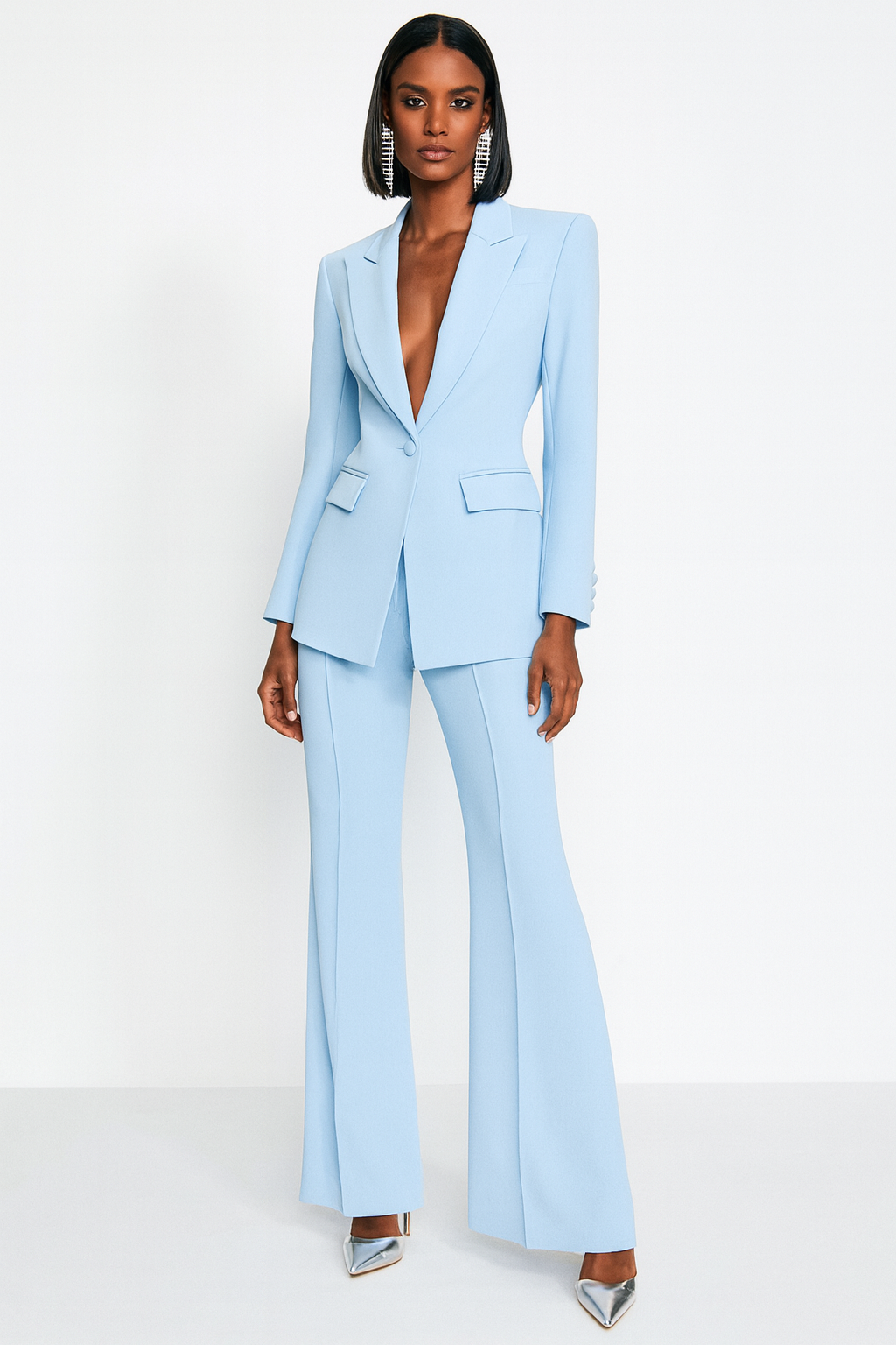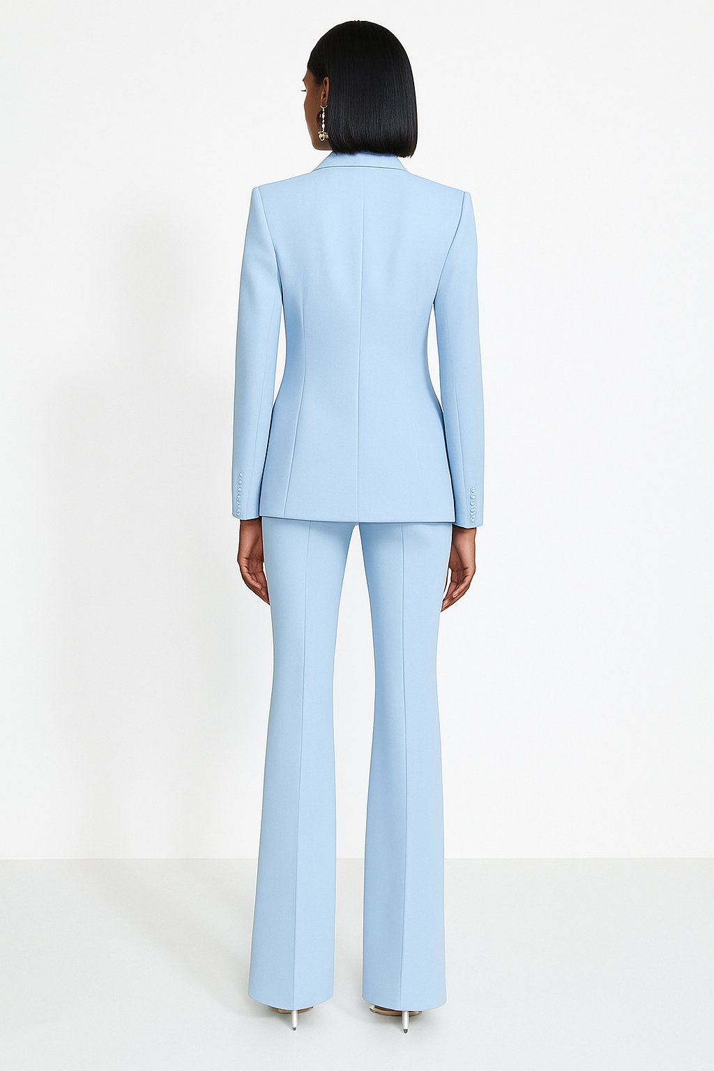 paired with high-waisted flared trousers that elongate the silhouette. The soft pastel hue brings a refreshing and feminine twist to classic suiting,