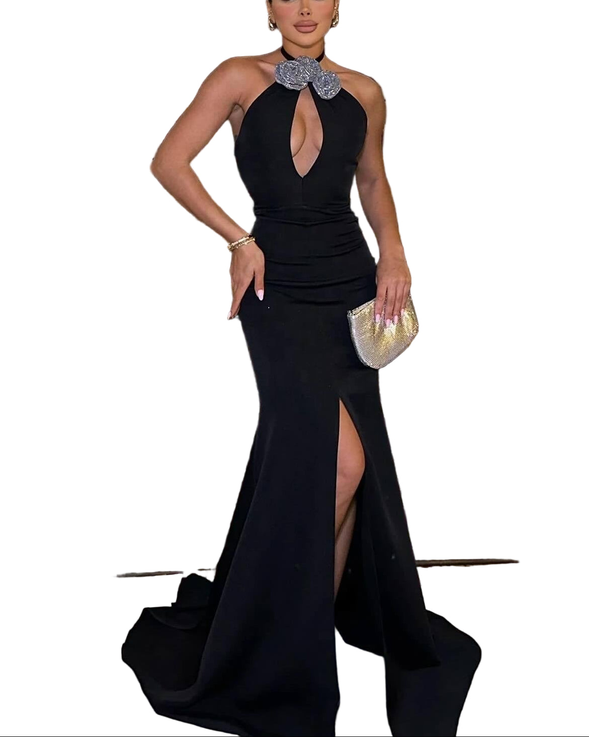 Get ready to steal the spotlight in our BlacHalter Gown! This stunning black evening gown features a daring halter neckline and a plunging front cut-out that’s sure to make heads turn. With oversized silver crystal flower embellishments adding a touch of sparkle, you'll feel like a walking masterpiece. Plus, the high slit on one side gives you that bold yet classy vibe. Who knew elegance could be this fun?