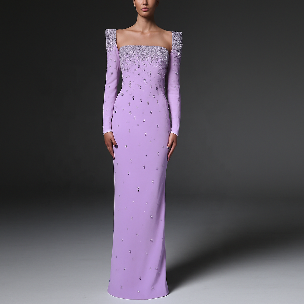 The Amethyst Grace gown is a floor-length couture piece crafted in a soft lavender hue, designed to exude elegance and refinement.