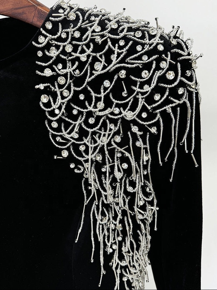 💎 Dramatic Glamour: Intricate silver crystal embellishments for a stunning look.
